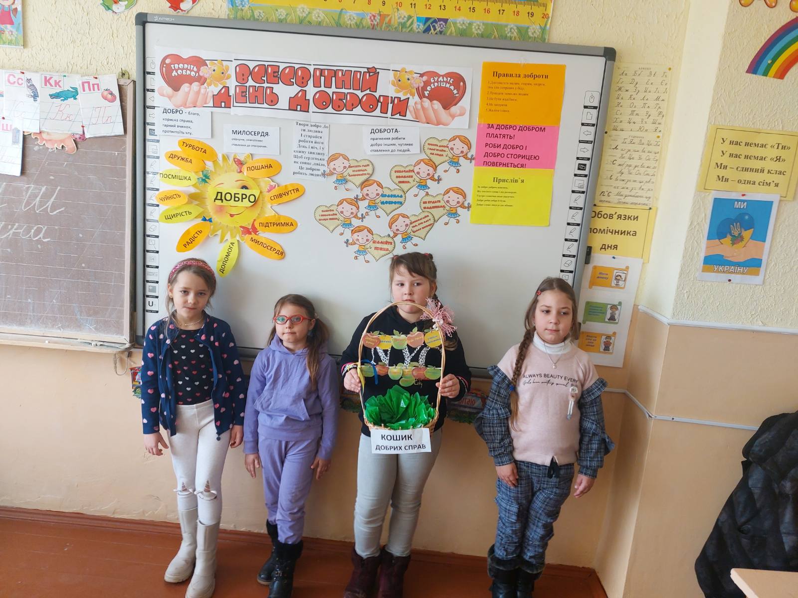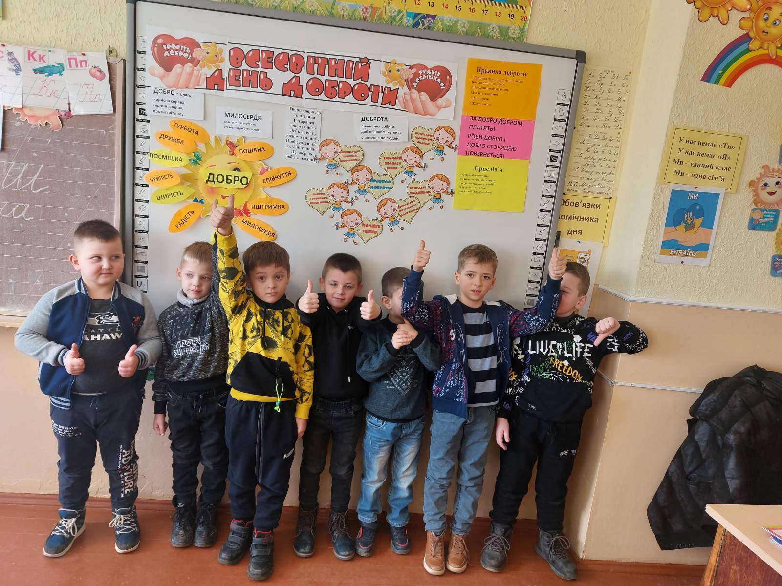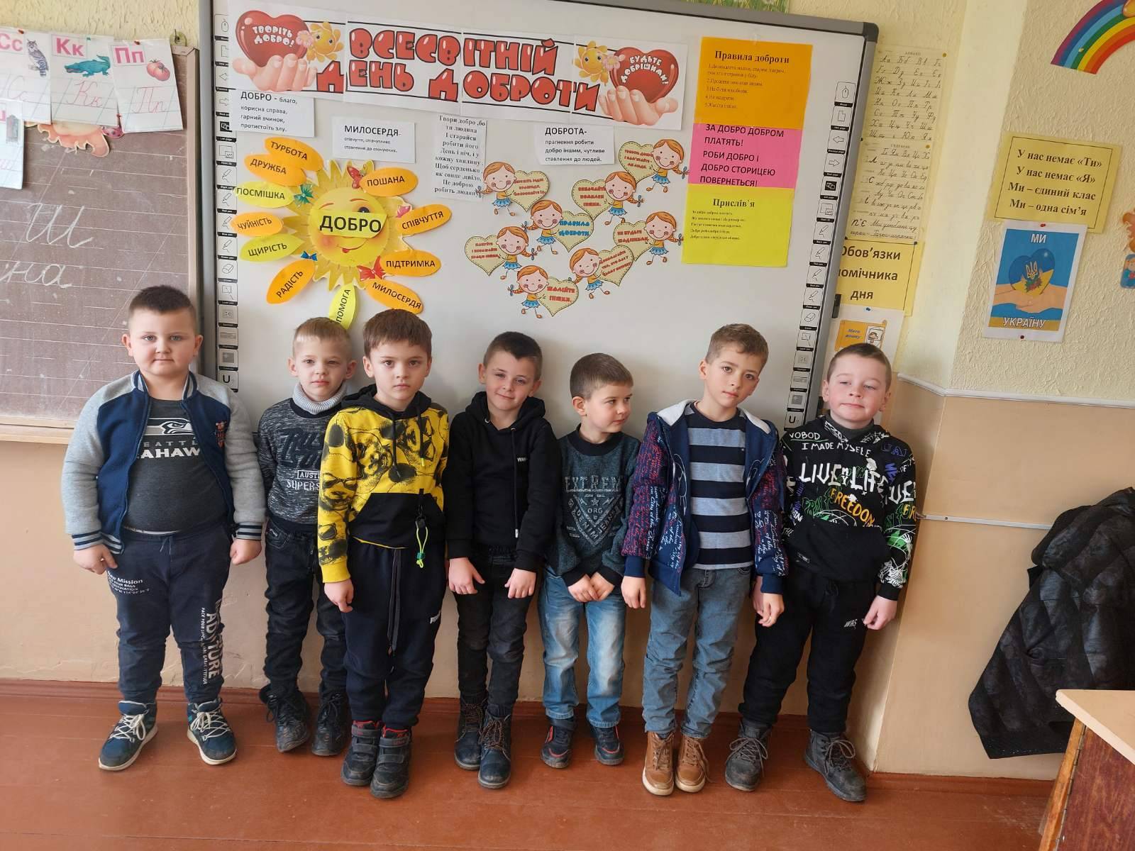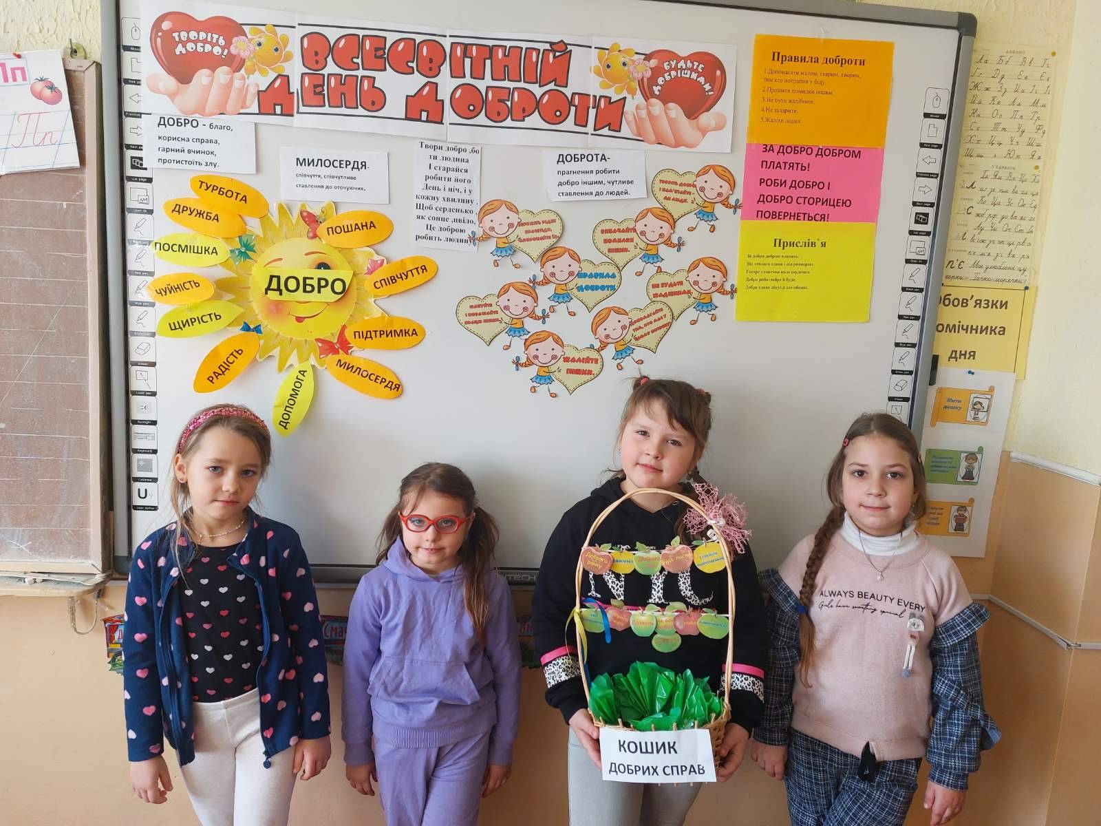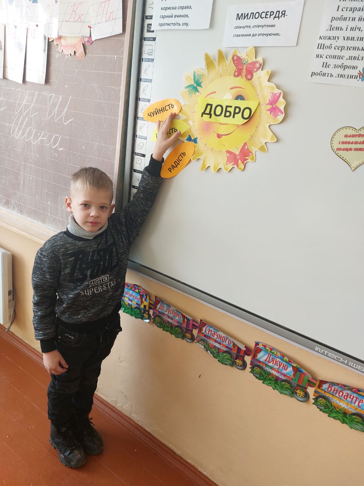 17.02 учні 1 класу провели виховну годину “Хай оживає істина стара-людина починається з добра”, присвячену спонтанному прояву доброти. Дівчатка і хлопчики засвітили сонечко доброти своїми промінчиками, на яких були написані слова,які асоціюються із добром та добротою.Якраз саме зараз усім потрібні ці прості, але вагомі слова…