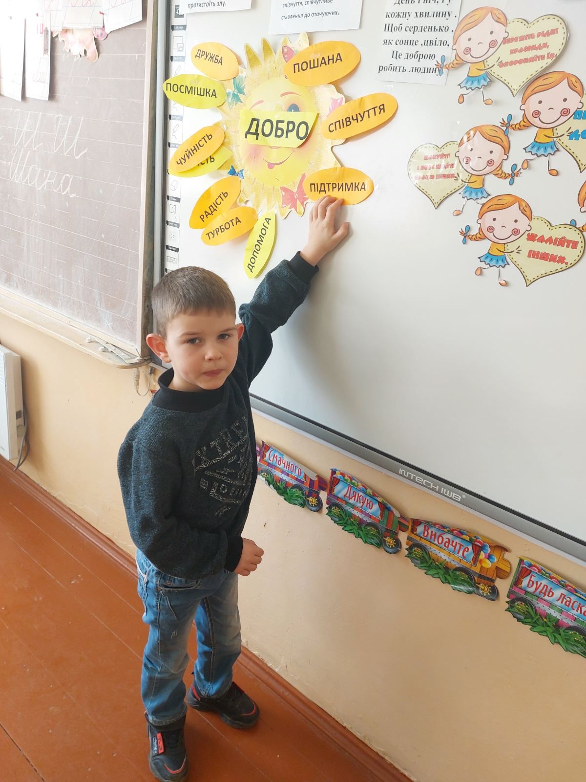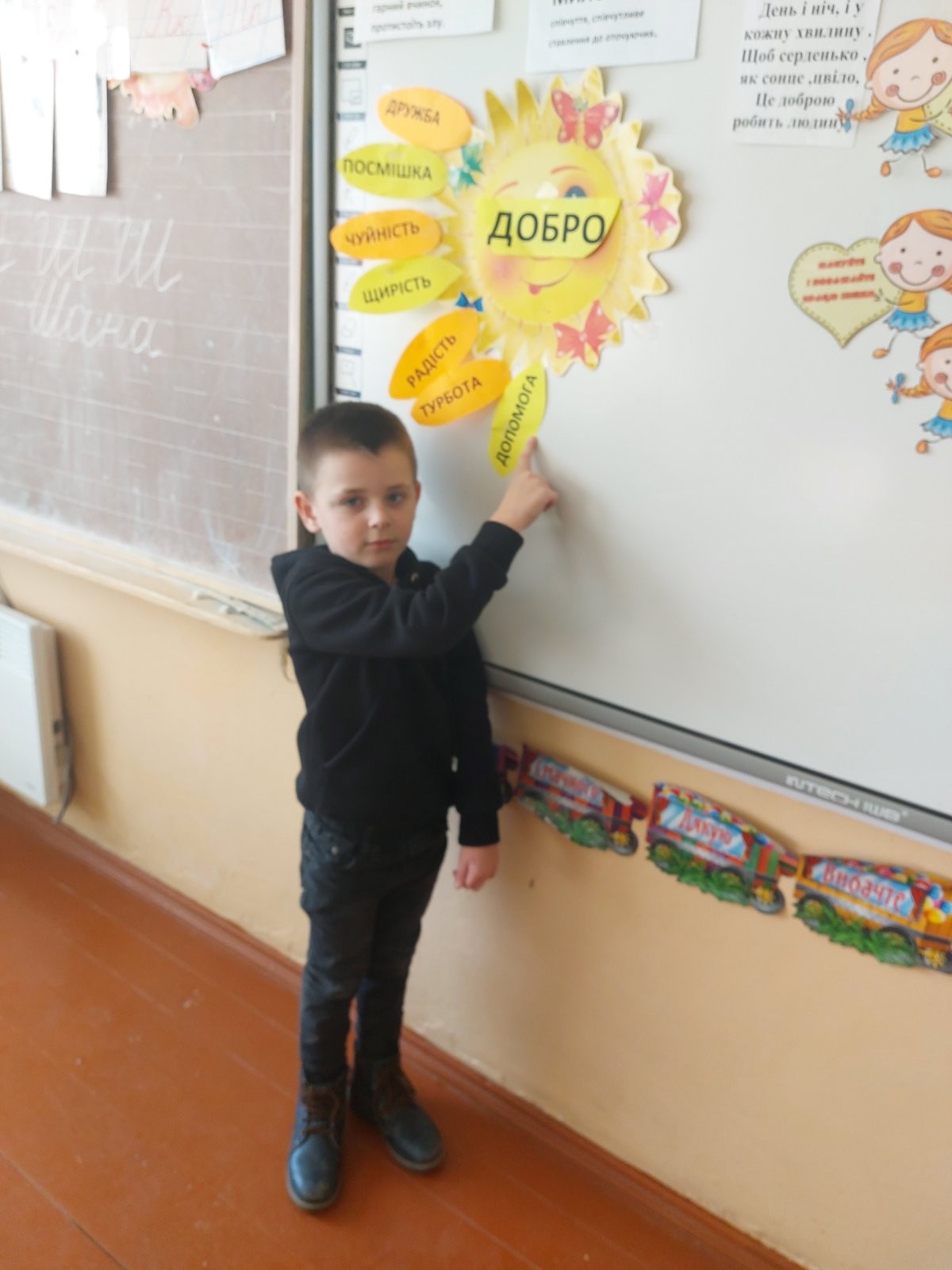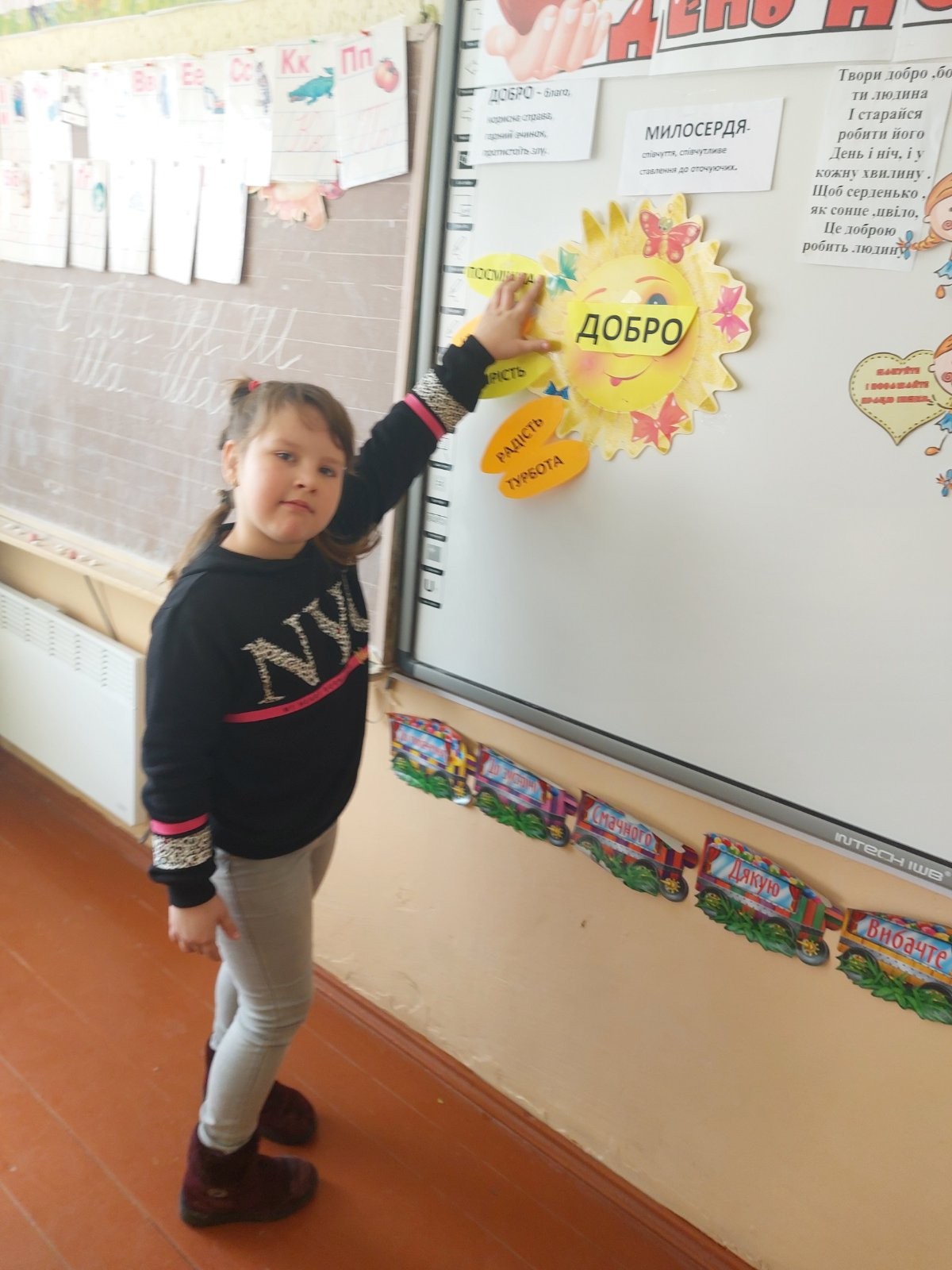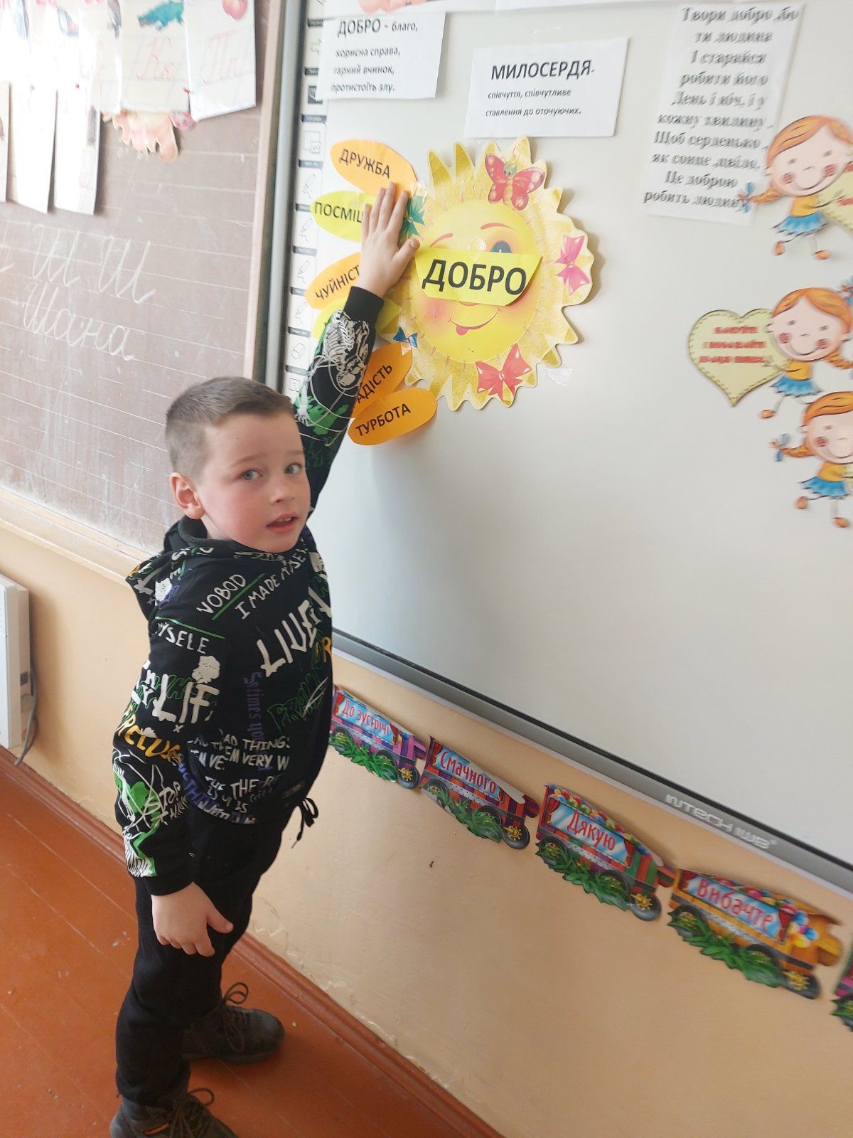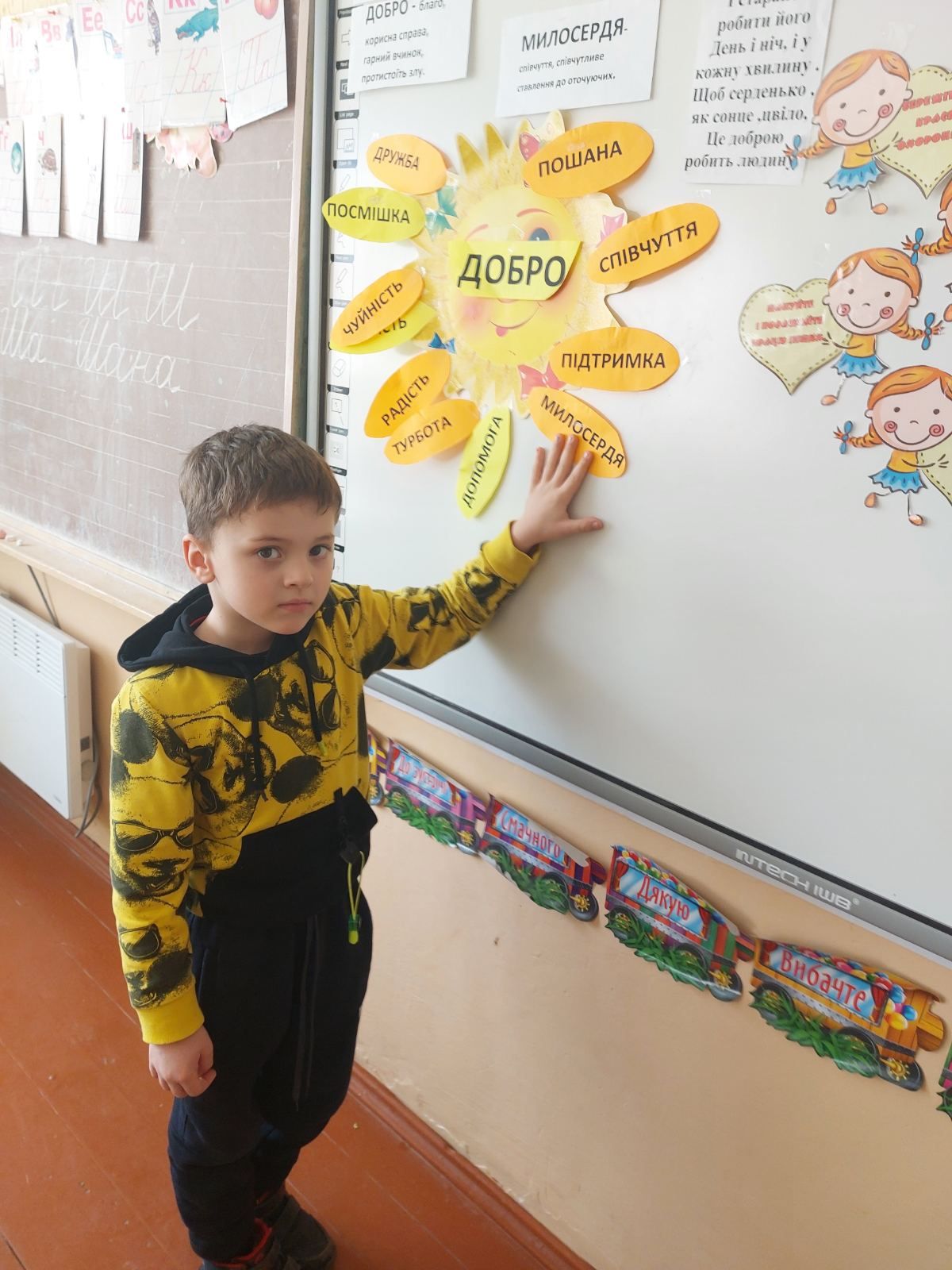 17.02 учні 1 класу провели виховну годину “Хай оживає істина стара-людина починається з добра”, присвячену спонтанному прояву доброти. Дівчатка і хлопчики засвітили сонечко доброти своїми промінчиками, на яких були написані слова,які асоціюються із добром та добротою.Якраз саме зараз усім потрібні ці прості, але вагомі слова…